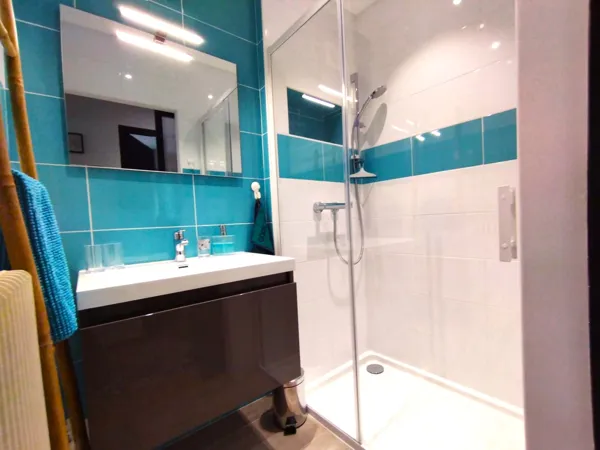 Avec une entrée privative, elle offre un accès à deux chambres élégamment décorées, alliant confort et modernité (Wi-Fi et connexion Ethernet fibre). Une salle d’eau et des WC séparés viennent compléter cet espace accueillant.