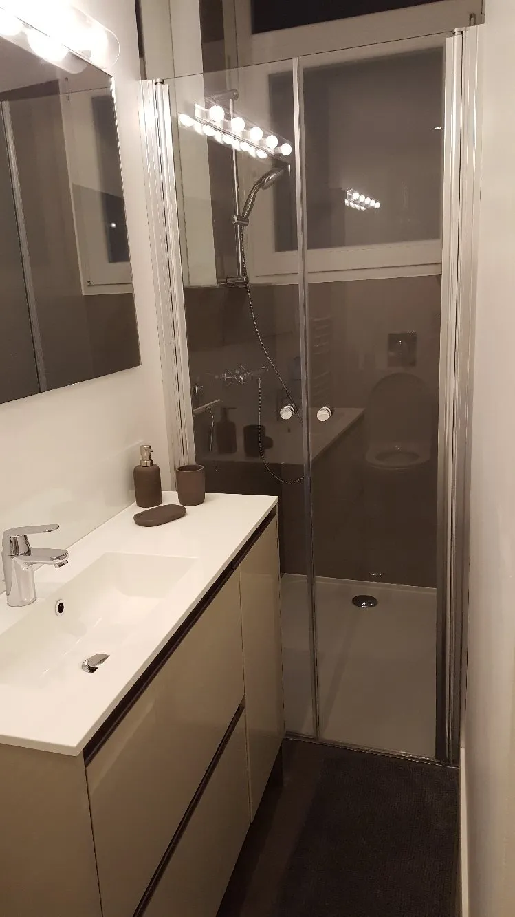 Appartement rénové comprenant une grande entrée avec placard, une pièce principale avec literie en 160X200, un bureau, une cuisine intégrée et une salle de douche avec toilettes. Linge de lit, de maison et de toilette fournis. Kit de première nécessité et de nettoyage à votre disposition. Appartement non-fumeur, animaux non autorisés. Parking à proximité (non compris). Equipements : Lave-vaisselle, réfrigérateur, four, plaque vitrocéramique, micro-onde, hotte, Presse-agrume, grille-pain, cafetière, bouilloire, vaisselle et ustensiles de cuisine, défroisseur, aspirateur, sèche-cheveux, chauffage, télévision, accès Wifi.